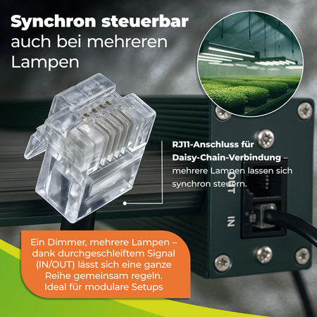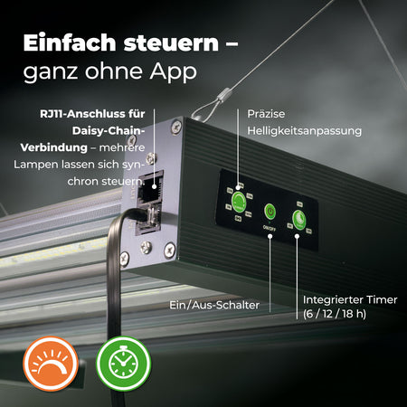 Das robuste, langlebige Gehäuse ist nach IP65 spritzwassergeschützt und damit ideal für den Einsatz im Gewächshaus oder im Indoor-Garten geeignet. Über die 0–10 V Dimmfunktion (Steuergerät erforderlich) lässt sich die Lichtintensität stufenlos anpassen – perfekt abgestimmt auf die Bedürfnisse von Jungpflanzen, Wachstums- oder Blütephase.