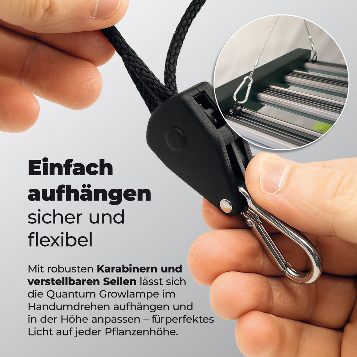 Dank IN/OUT-Funktion können mehrere QUANTUM-Lampen synchron betrieben werden, wodurch sich größere Setups einfach und effizient steuern lassen. Die Lampe ist sofort einsatzbereit und wird mit einer Aufhängevorrichtung inklusive Karabinern und Seilen geliefert. Energieeffizient, leistungsstark und zuverlässig – die ideale Lösung für ambitionierte Hobbygärtner und professionelle Anzuchten.