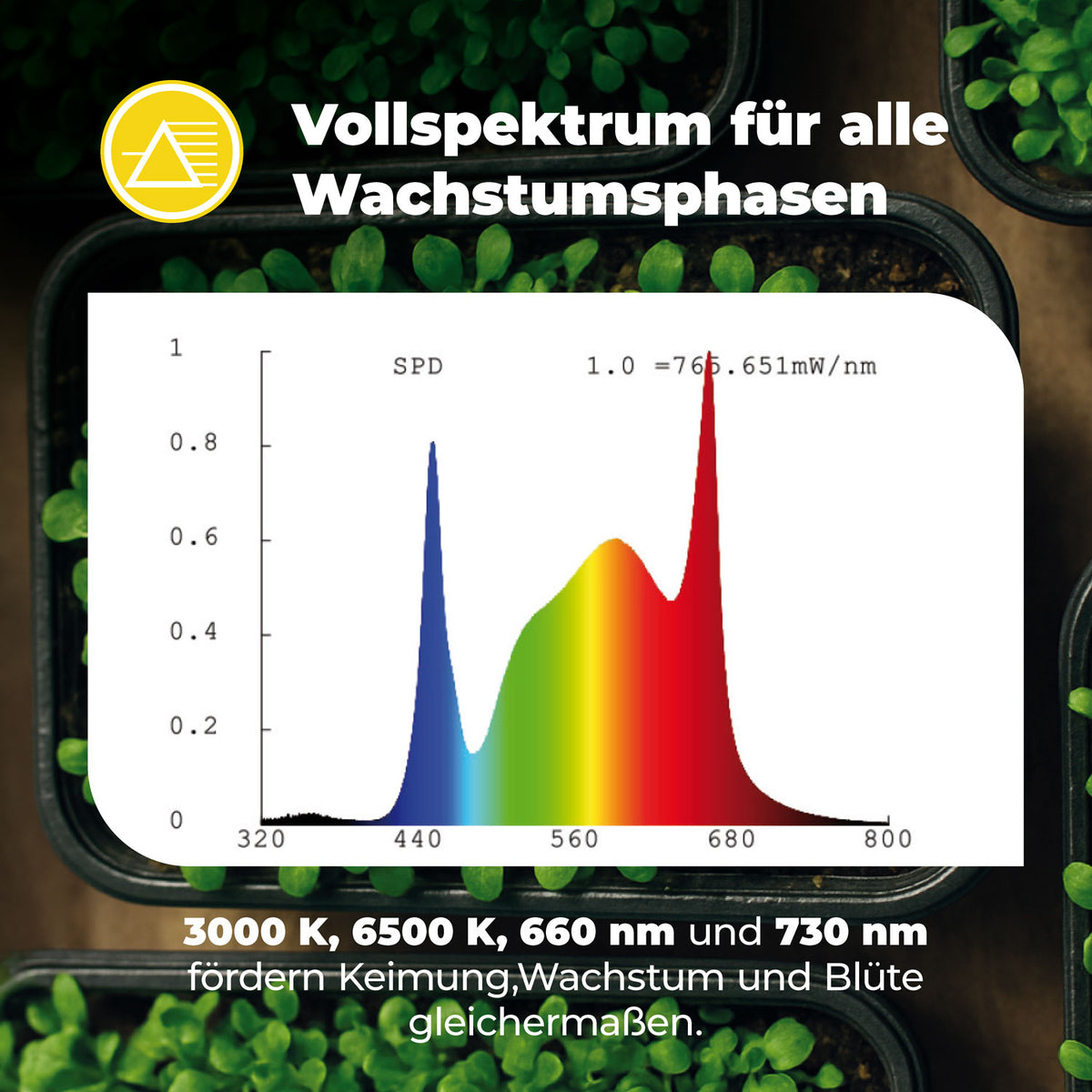 - Optimiertes Lichtspektrum: 3000 K, 6500 K, 660 nm & 730 nm für natürliches Pflanzenwachstum