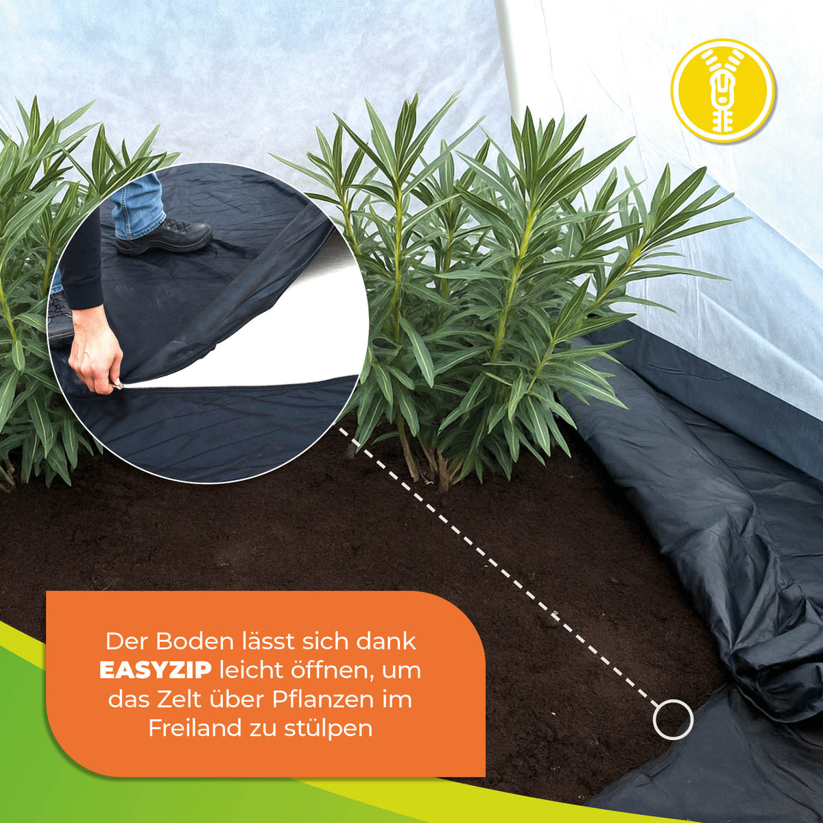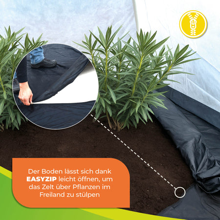 - Boden mit Reißverschluss zum Öffnen: So ist das Zelt auch ideal für Pflanzen im Beet geeignet.