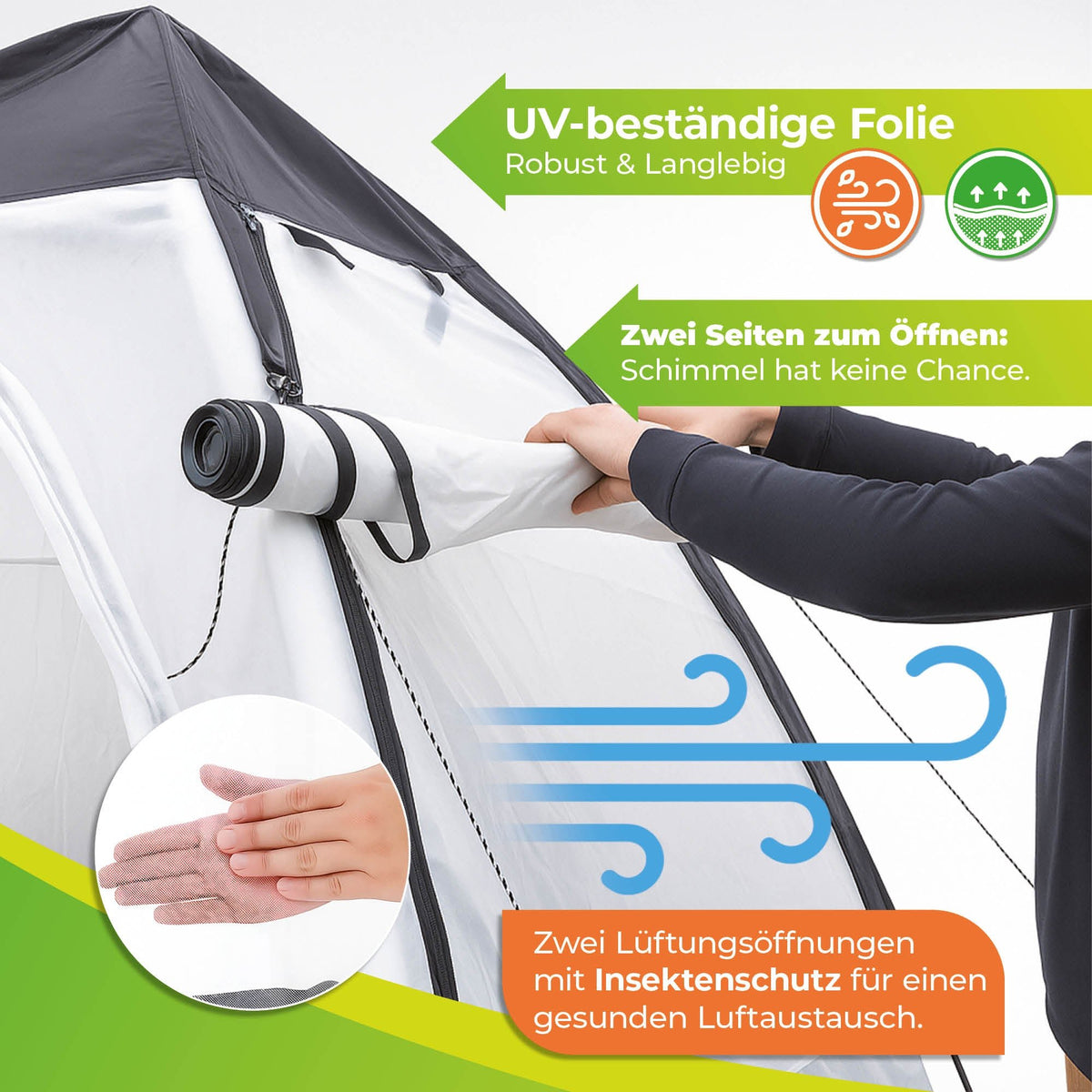 - Lichtdurchlässige, UV-beständige Folie: So genießen Ihre Pflanzen auch im Zelt das lebensnotwendige Tageslicht. Die hochwertige, mehrfach laminierte Rainexo-Folie ist dafür konzipiert, mehrere Jahre im Garten im Sonnenlicht ausgesetzt zu sein. Deshalb geben wir 5 Jahre Garantie auf die UV-Beständigkeit.