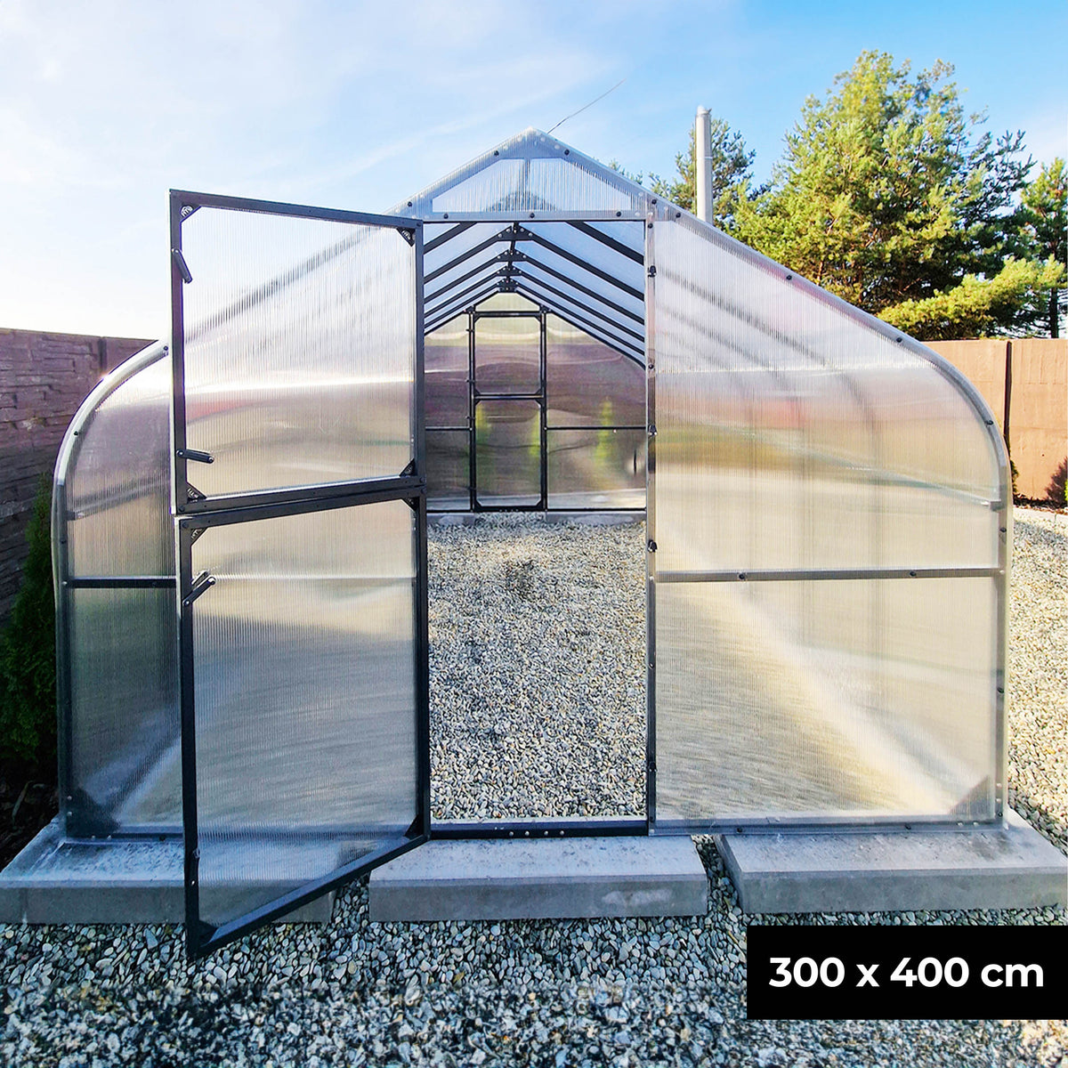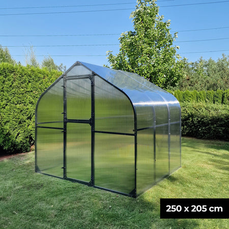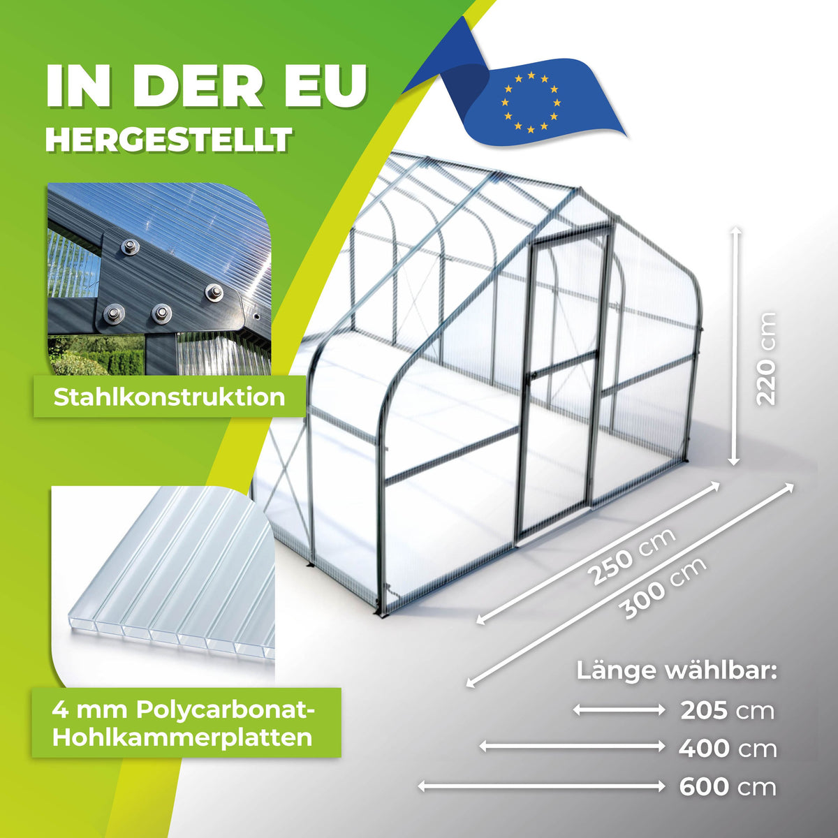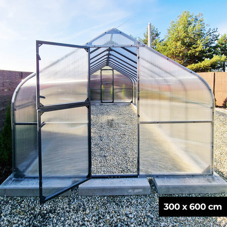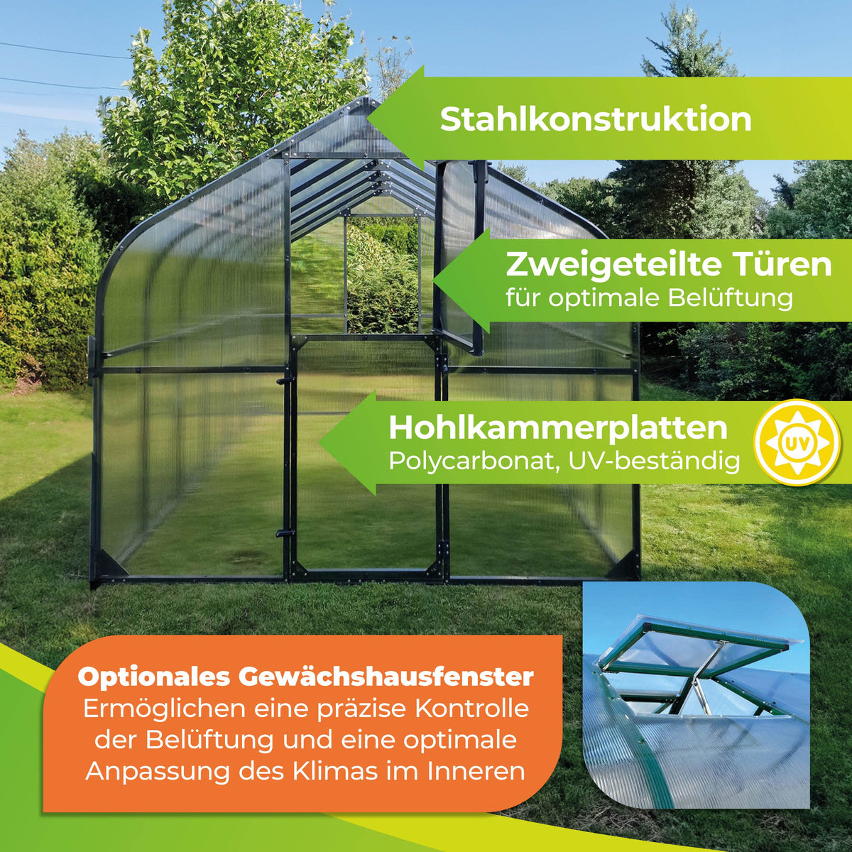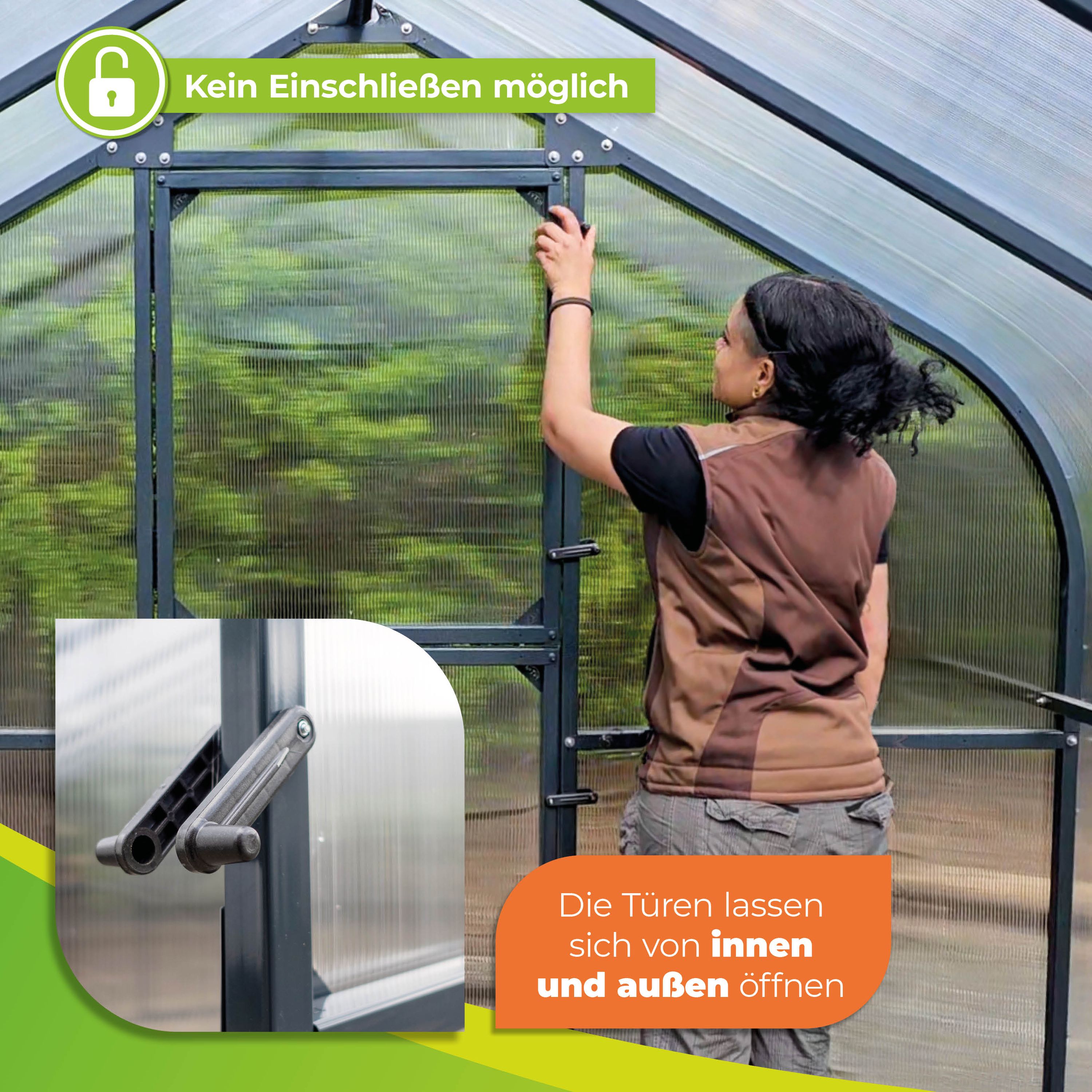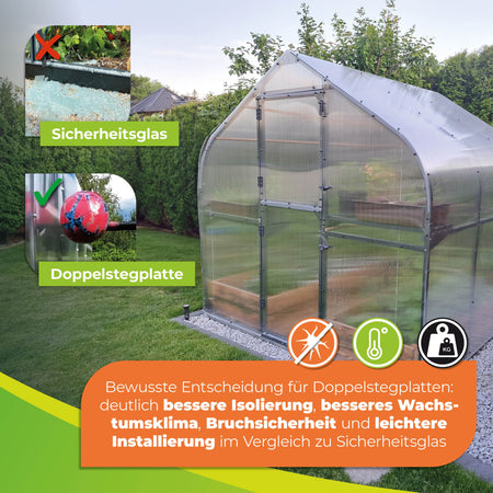 Das robuste Rahmengestell aus Stahl gewährleistet eine hohe Stabilität, während die leichten Kunststoffscheiben aus Polycarbonat für eine optimale Lichtdurchlässigkeit sorgen. Die Kunststoffscheiben sind zudem UV-beständig. Sie werden also nicht porös. So haben Sie lange Freude an Ihrem Gewächshaus.