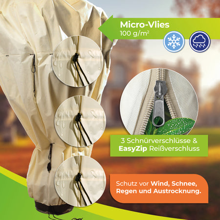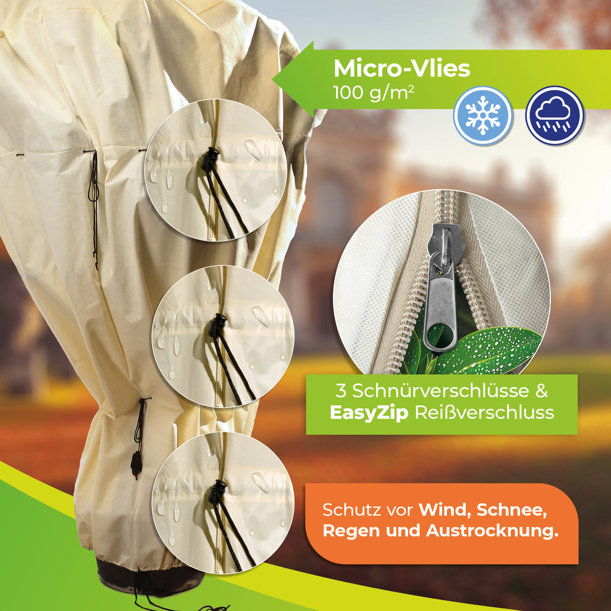 Die robuste Schutzhülle in ihrer ausladenden Größe verspricht einen Frostschutz für Bäume und Büsche größeren Kalibers. Unser Kübelpflanzensack lässt sich mit der Kombination von Reißverschluss und Schnürverschluss ebenso problemlos wie sicher verschließen.