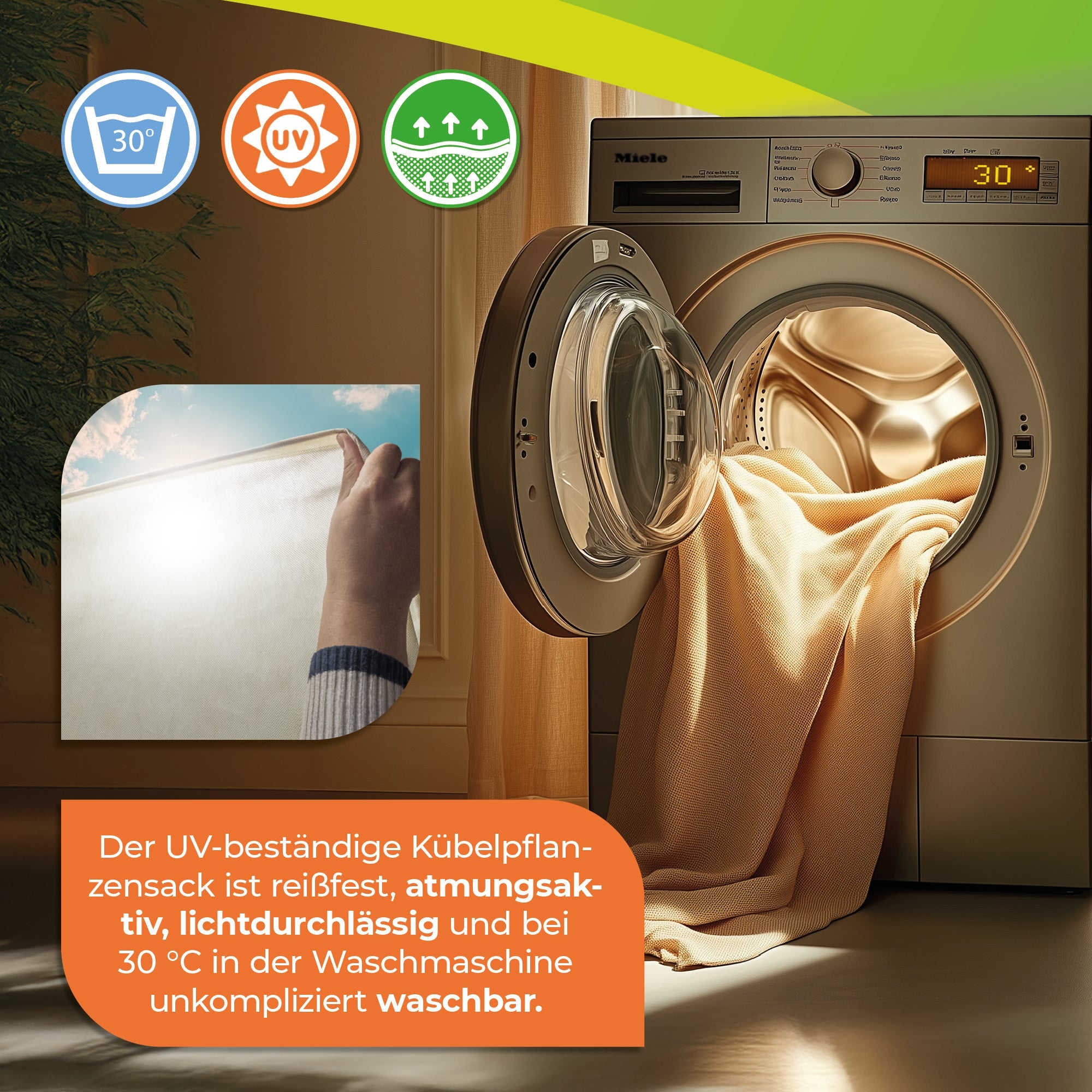 PREMIUM MICRO-VLIES 100 g/m²: Der UV-beständige Kübelpflanzensack ist reißfest, atmungsaktiv, lichtdurchlässig und lässt sich unkompliziert bei 30 °C in der Waschmaschine reinigen.