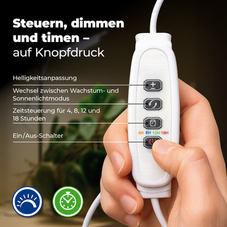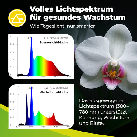 - Zwei Lichtmodi: Wachstumsmodus & Sonnenlichtmodus für jede Wachstumsphase