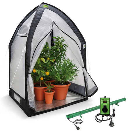 Bringen Sie Ihre Pflanzen sicher durch den Winter. Mit diesem Überwinterungs-Set gelingt Ihnen das ganz einfach. Im Überwinterungszelt "Icedome ThermoPLUS" finden kleine und große Pflanzen optimal Platz. Die 3-lagige Luftpolsterfolie isoliert optimal. So sind Ihre Pflanzen optimal vor Schnee, Frost und widrigen Wetterbedingungen geschützt. Die Pflanzen erhalten durch die lichtdurchlässig, UV-resistente Folie auch im Zelt das lebensnotwendige Sonnenlicht. Für zusätzliche Isolierung sorgt der Alu-Reflektor-Boden: die Kälte von unten bleibt draußen, die Wärme der Sonneneinstrahlung und einer separat erhältlichen Gewächshaus-Heizung bleibt drin und wird auf die Pflanzen reflektiert. Das sorgt für gesundes Pflanzenwachstum. Mit dem umlaufenden 5 cm hohen Klettverschluss mit Flausch befestigen Sie den Boden dicht und fest am Zelt - auch wenn Sie z.B. ein Kabel für eine Heizung ins Zelt legen. Durch die gute Isolierung des Zeltes sparen Sie außerdem Energie, denn Sie müssen weniger heizen.